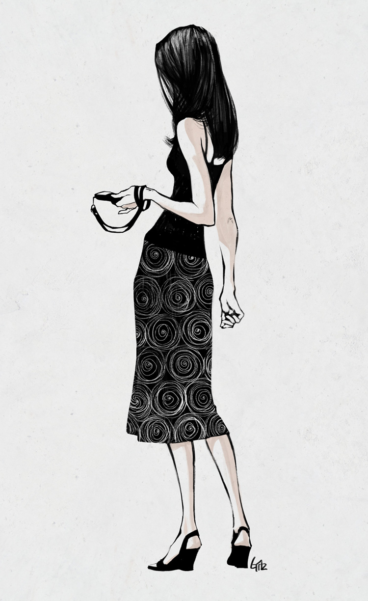 Una chica que vi en la Mozarthaus de Viena, asi de delgada, vestida de negro y blanco (mas negro que blanco) y con la piel de ese color.. Ella sola ya era un dibujo. Asi la recuerdo, con la audio-guia en la mano... ^_^